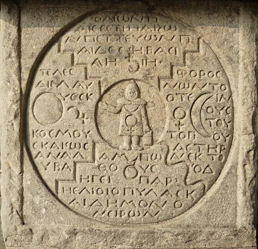 200~250年頃。黄道十二宮の天球に立つアイオーン。その前に座る大地母神テッルス(ガイア)と四季を表す四人の子。